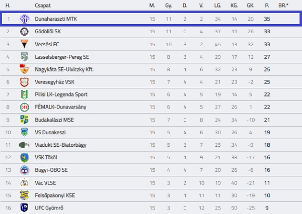 15 mérkőzésen, 11 győzelem, 2 döntetlen, 2 vereség, 34-14-es gólarány, 35 pont.
