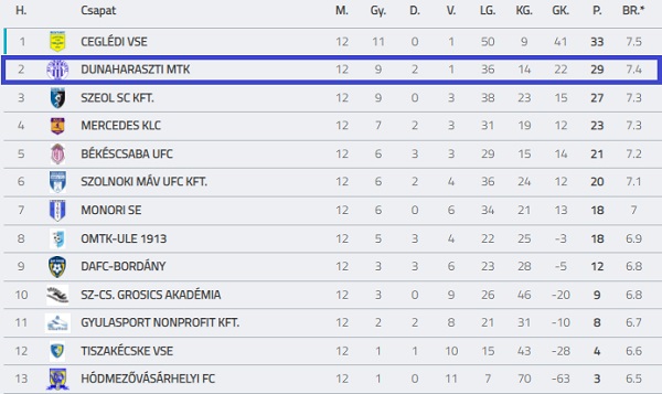 12 mérkőzésen, 9 győzelem, 2 döntetlen, 1 vereség, 36-14-es gólarány, 29 pont.